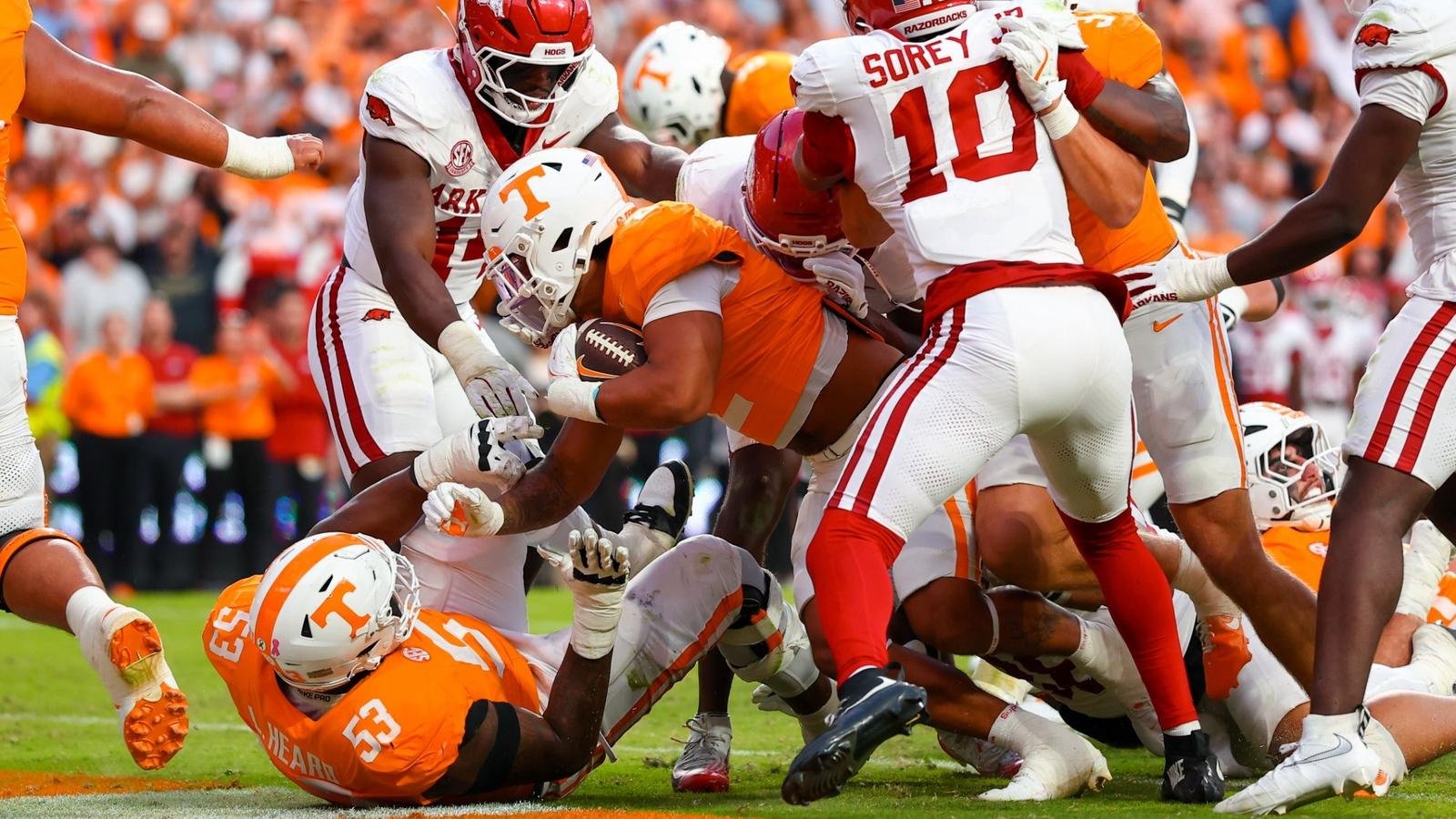 Pertahanan Big Orange melanjutkan keinginannya di kuarter keempat, dengan Josephs menekan Green dan memaksakan dirinya ke tangan gelandang pemula yang menunggu. Jadon Perlotte di garis 19 yard Razorbacks. Empat permainan kemudian, Lewis berlari ke kanannya dan berusaha keras menuju papan catur untuk membuat skor menjadi 34-17 dengan waktu tersisa 13:15.