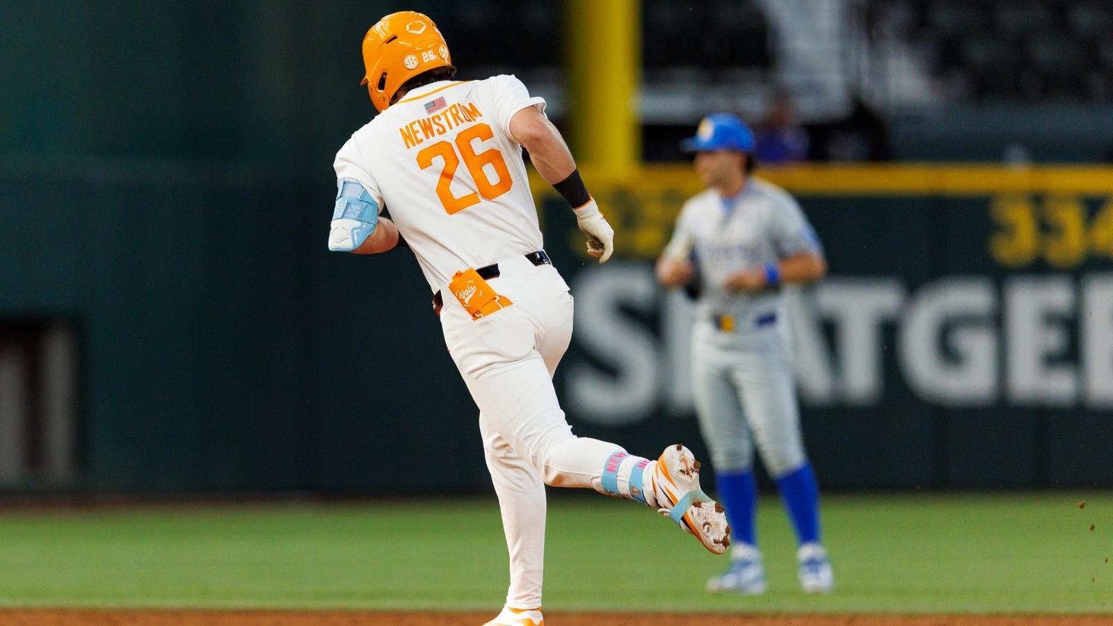 Chris Newstrom memicu reli dengan home run ke kiri lapangan, yang pertama tahun ini. Setelah Tennessee memuat pangkalannya, Tyler Myatt datang dengan kopling, RBI single dua keluar dan Batu melanggar hukum Sebuah single RBI miliknya menyusul, menjadikannya permainan 5-4.