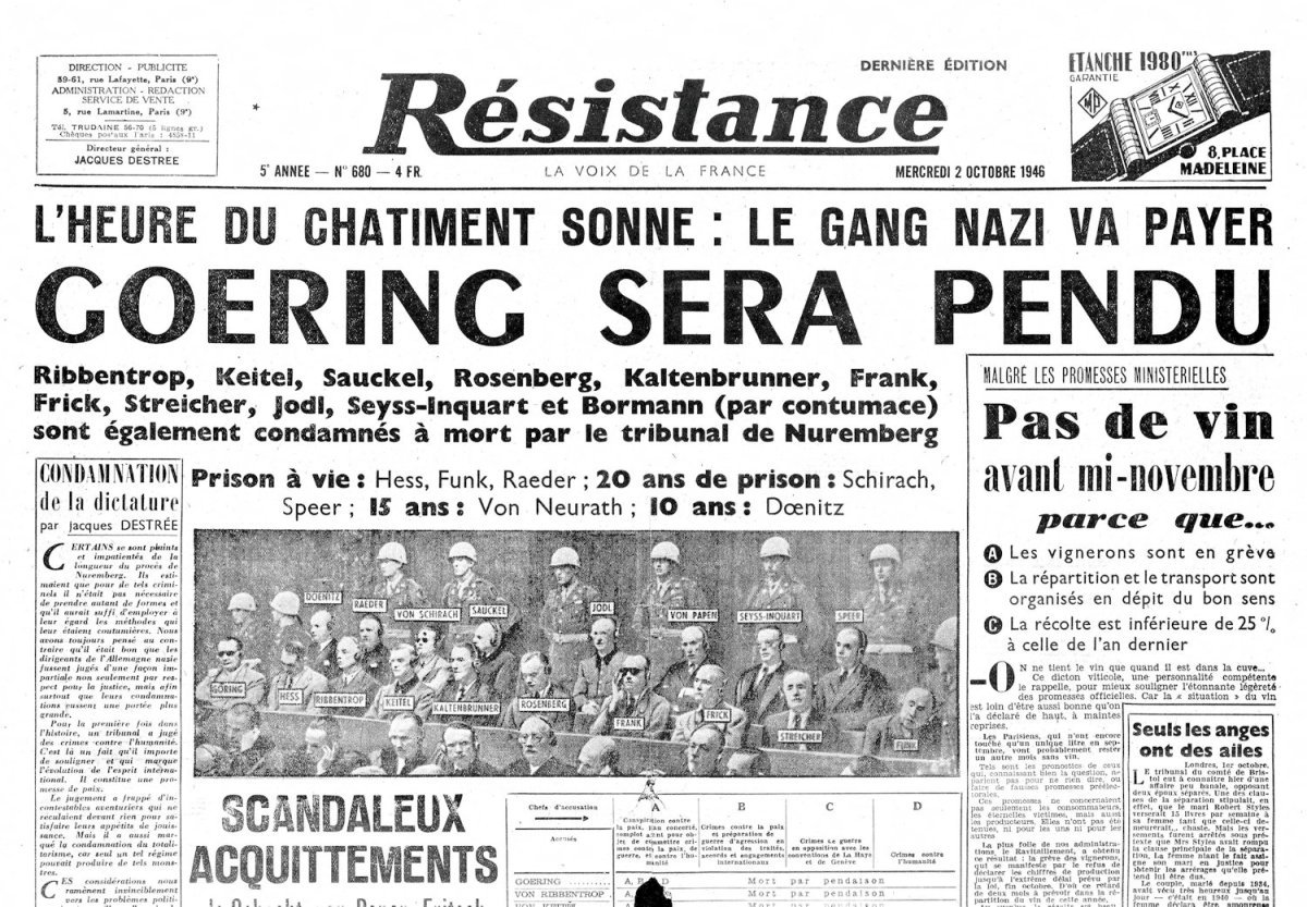 30 dan 1 Septembereh Pada bulan Oktober 1946, para hakim menyampaikan keputusan mereka: dua belas hukuman mati dengan cara digantung, termasuk hukuman Göring, Frank, Jodl, Keitel, Ribbentrop dan Rosenberg. Hukuman penjara untuk Dönitz, Funk, Hess, Schirach dan Albert Speer… Schacht, Menteri Urusan Ekonomi sampai tahun 1937 dan Presiden Reichsbank sampai tahun 1939, Fritzsche, pegawai Goebbels, yang bertanggung jawab atas pers dan radio di Kementerian Propaganda Reich, dan von Papen, salah satu aktor Anschluss di Wina pada tahun 1938, dibebaskan.