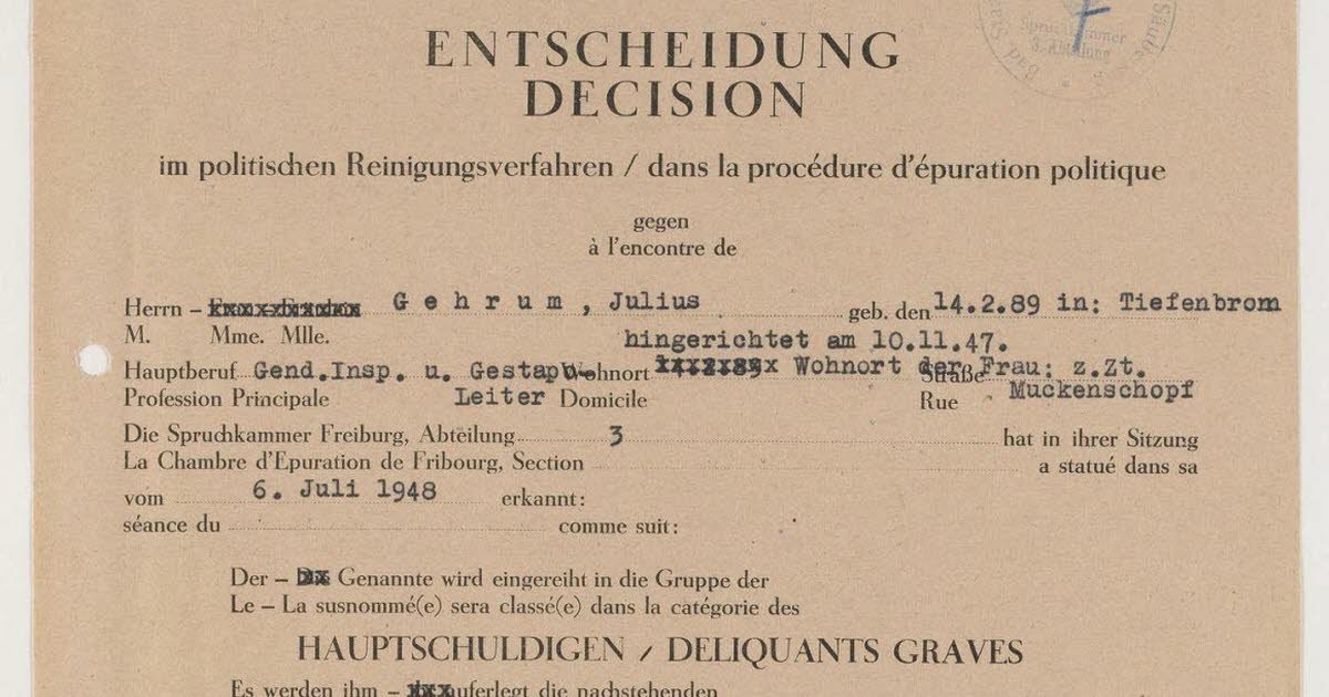 Sumber-sumber digital ini misalnya, menyangkut Julius Gehrum, kepala Gestapo di Strasbourg dari tahun 1940 hingga 1944, yang dijatuhi hukuman mati dan dieksekusi pada bulan November 1947. Atau bahkan Hanns Martin Schleyer yang, meskipun memiliki masa lalu Nazi, menjadi perwakilan pengusaha Jerman setelah perang. Yang terakhir diculik dan dieksekusi pada tahun 1977 oleh kelompok kecil ultra-kiri “Fraksi Tentara Merah”. Mayatnya ditemukan di Mulhouse.