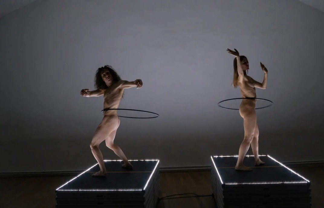 Duo pemberani yang menciptakan kembali hula hoop sebagai instrumen koreografi, antara ekstasi yang gersang, hipnosis yang kejam, dan tarian kedaulatan yang menawan. Pertunjukan fisik dan artistik yang diciptakan 17 tahun lalu. Di sana kita menemukan dua protagonis dan kaki tangannya, François Chaignaud dan Marie-Caroline Hominal, penari, pemain dan seniman visual.
