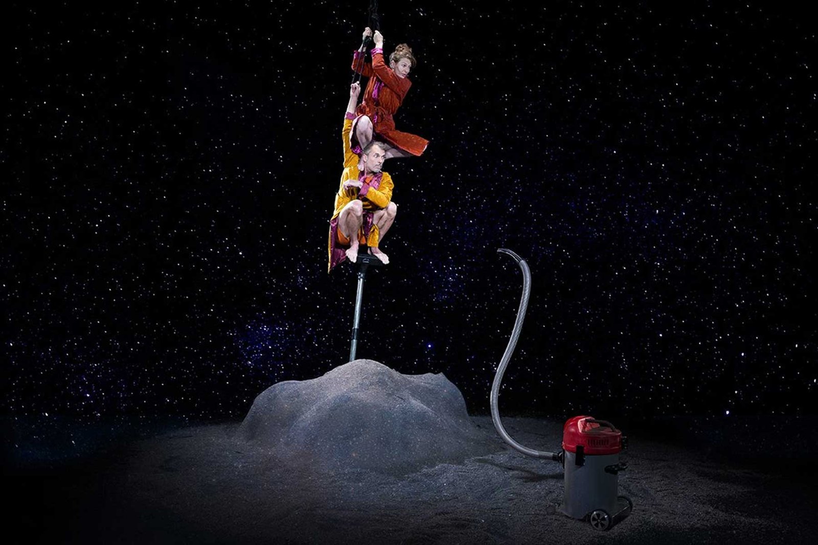 Di atas panggung, dua karakter terjebak dalam tumpukan debu, dan segera disusul oleh penyedot debu yang semakin mengancam dan mungkin menelan mereka utuh!