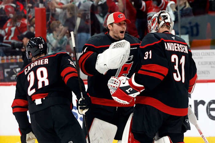 RALEIGH, NC – Carolina Hurricanes akhirnya mengalahkan penjaga gawang yang hebat di babak playoff NHL untuk mengamankan kemenangan perpanjangan waktu sampai tayangan ulang membalikkan hasilnya.