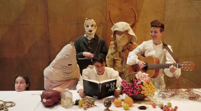 Mengawali deskripsi sebuah adegan perang tentunya juga merupakan cara bagi seniman untuk mengungkapkan kedekatan yang mereka lihat antara konteks di mana Rabelais mengarang karyanya dan zaman kita.. Kekacauan kemarin, dengan Reformasi dan banyaknya peperangan yang dilakukan Francis I terhadap Prancis, mengingatkan kita pada hari ini. Terbukti dari foto para pemimpin dunia kita, Trump di tengahnya, itu Sara Cosset digantung di panel kayu setelah Hieronymus Bosch dan karya serta dokumen lain dari masa lalu dipasang. Sementara iniEloise Guerineau Dan Mayeul Victor-Pujebet mengambil alih cerita, dengan penguasaan bahasa yang sangat kompleks yang ditemukan oleh Rabelais, sehingga membuka bidang prosa sastra. Berkat kompromi halus antara bahasa isyarat dan koreografi yang biasa mereka gunakan untuk memproses kata kerja Pantagruel dan karya-karya lain di kemudian hari – pada dasarnya adalah Seperempat pon – para pemain memasuki hubungan yang intim dan menyenangkan dengan bahasa Prancis seperti yang dibuat dan digerakkan oleh François Rabelais. Kesuksesan besar tim ini terutama disebabkan oleh permainan dengan bentuk yang bergerak, hingga kerentanan yang memberi mereka kesan menemukan kembali diri mereka sendiri selama pertunjukan.. Kedatangan isyarat dan kata kerja Pantagruel yang saling terkait di teater ini, dalam pribadi sang aktor Julien Geffroymembentuk salah satu dari banyak patahan dan diskontinuitas yang menjadi dasar pembuatan potongan tersebut. Raksasa tontonan ini bertanggung jawab atas kisah terkenal kelahirannya, yang menyebabkan kematian ibunya Badebec, putri raja Amaurotes, masa kecilnya yang rakus akan makanan dan pengetahuan serta banyak petualangannya, dan dengan rela mengungkapkan kesalahannya dan kesalahan teater. Karena sifatnya yang tidak mampu mengakomodasi ilusi raksasa sekalipun, panggung di sini adalah tempat banyaknya karya buatan sendiri, salah satu kualitas hebatnya adalah menampilkan dirinya seperti itu dan terus-menerus bersenang-senang dengan kecerdasannya sendiri.