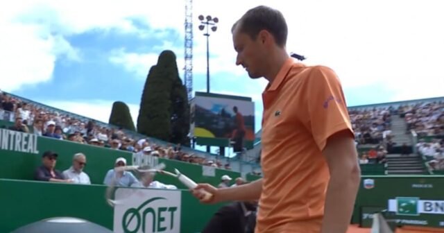Setelah kalah dalam delapan game pertama berturut-turut, unggulan ketujuh sudah merasa muak. Dia berbalik ke belakang lapangan dan melemparkan tongkat pemukulnya dua kali. Medvedev beralih ke raketnya, mengambilnya dan membantingnya ke tanah, mengulanginya beberapa kali hingga akhirnya patah.