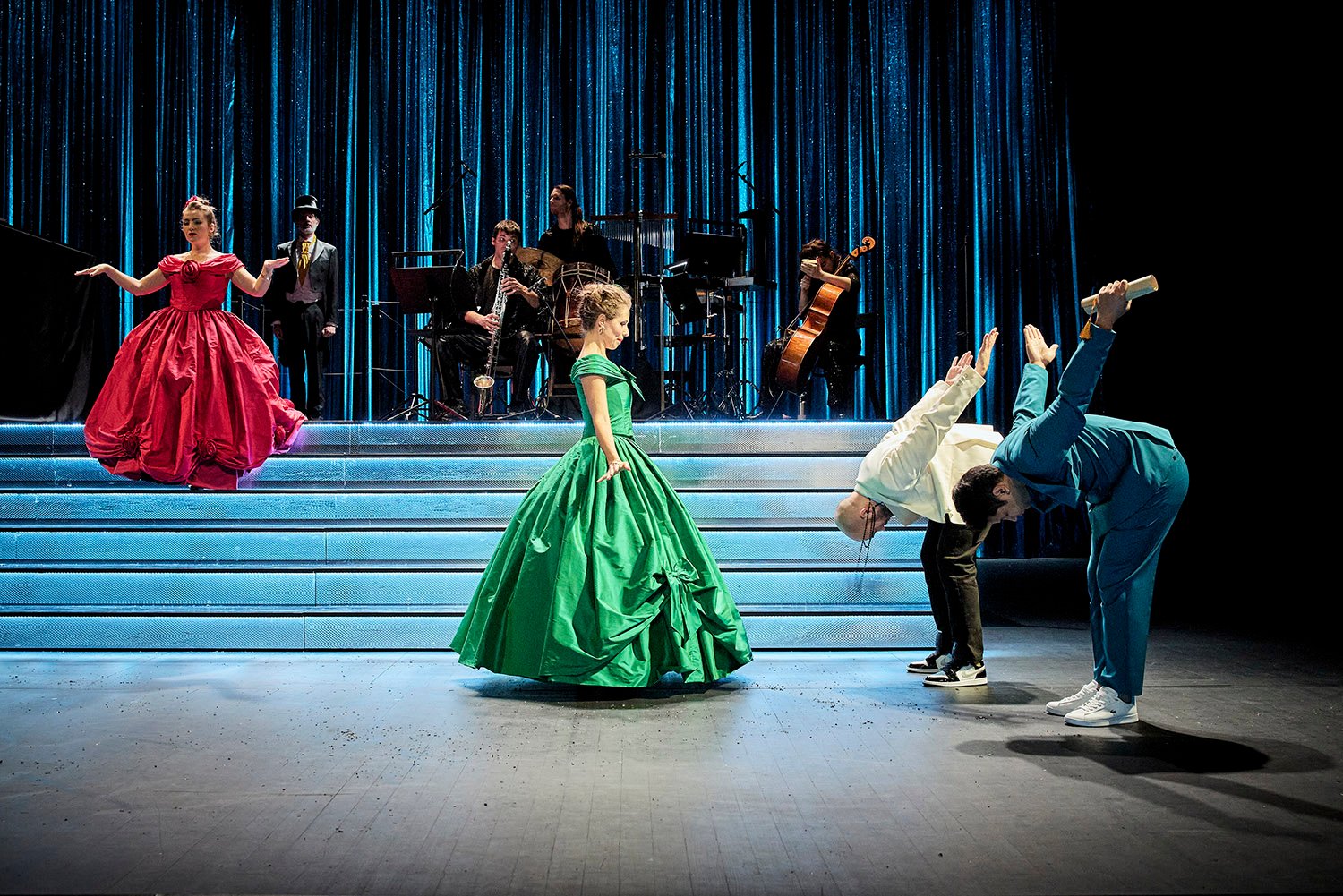 Kakak iparnya yang nakal pada gilirannya adalah figur kaki berharga yang sangat menarik dan menggelikan, penuh semangat dengan semangat pedas. Clarisse Dalles Dan Romie Esteves. Olivier Naveau memberi ayah Cinderella, mantan pedagang kelontong yang menjalani hukuman penjara sebelum menjadi baron, suasana komik dan nostalgia. Sang pangeran dan pelayannya, Tsanta Ratia dan Enguerrand de Hys, terlibat dengan mudah dan dalam jumlah histrionik yang tepat dalam permainan yang layak untuk dilakukan marivaudage yang menumbangkan semua hierarki sosial.. Lagipula, tidak ada Cinderella tanpa peri. Yang terakhir ini diwujudkan dengan sangat baik oleh Lila Dufiyang ‘Aku datang untuk memberimu harapan lagi’ Dihiasi dengan iringan denting yang indah.