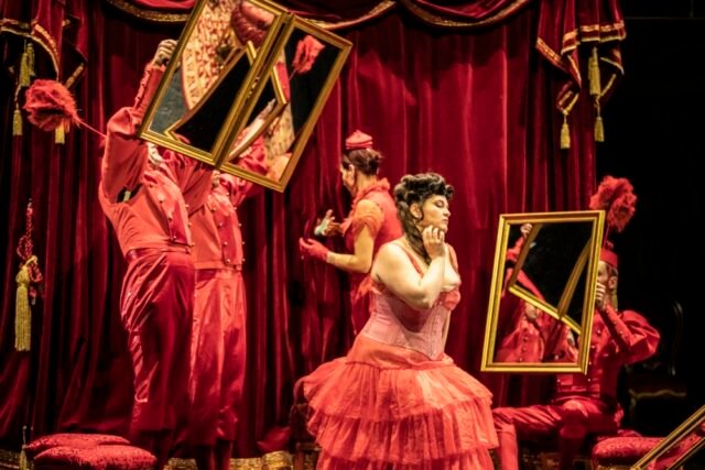 Terperangkap dalam pusaran tarian ringan, para wanita genit menyembunyikan stoking sutra berwarna cerah di bawah rok dalam hitam panjang dan kemudian dengan bangga menampilkan daging mereka yang melengkung dan menggoda dalam korset kecil atau crinoline, keduanya dihiasi dengan bulu dan pinggiran yang mengingatkan dunia kabaret. Tanpa pernah melakukan voyeurisme yang memalukan, Emma Dante menunjukkan wanita-wanita ini dalam keintiman penuh mereka. Kami mengakui humor, antusiasme, dan empati sutradara. Namun, kekasaran teaternya dengan karakternya yang agak kasar tampak lebih moderat dibandingkan opera. Kemewahan formal yang melekat dalam genre lirik memungkiri kesopanan efektif dari pencapaian teatrikalnya. Didikte oleh partiturnya, tempo lincah, bahkan hiruk pikuk yang biasa ia miliki juga cenderung memudar, meski di bawah arahan musik. Sesto Quatriniyang berusaha untuk menjadi dinamis dan ramping, meskipun ada kehalusan sonik tertentu pada awalnya, dan yang terpenting tidak mencoba untuk terus menerus berada dalam kelesuan, bahkan dalam lagu yang sangat terkenal sekalipun. Selingan yang meresmikan babak ketiga.