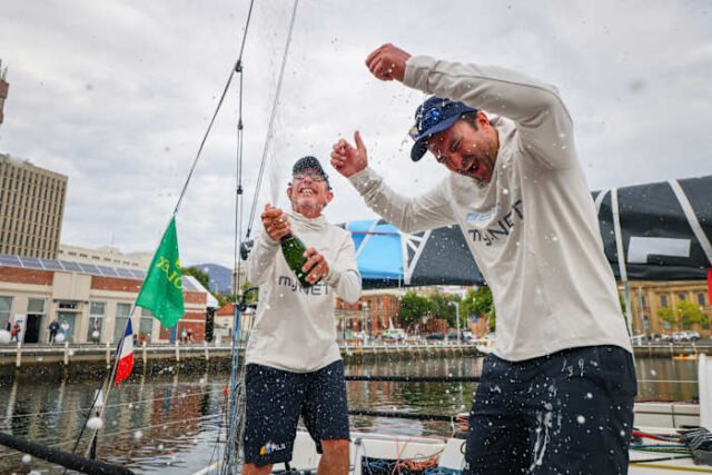 Michel Quintin dan Yann Rigal tiba di Constitution Dock di Hobart pada Selasa pagi dengan kapal pesiar BNC sepanjang 35 kaki mereka setelah menghabiskan lebih dari 93 jam di laut. Mereka adalah awak ke-33 yang melewati garis finis, namun kapal pesiar dua tangan pertama, sebuah perahu yang hanya dilayari oleh dua orang, berhasil melaju dari start di Pelabuhan Sydney ke Hobart pada Jumat pagi lalu.