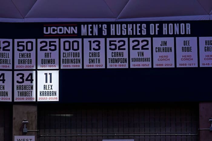 Karaban menjadi pemain bola basket putra UConn aktif pertama yang bergabung dengan Huskies of Honor dalam upacara pra pertandingan di Gampel Pavilion. Juara nasional dua kali, yang merupakan pemimpin putra sepanjang masa dalam kemenangan karir, naik ke posisi 10 dalam daftar pencetak gol karir dengan tembakan tiga angka selama pertandingan.