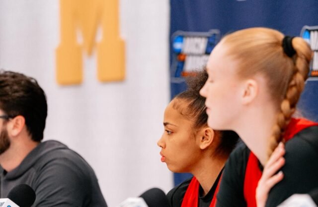 Atlet pelajar NC State Zamareya Jones dan Tilda Trygger serta pelatih kepala Wes Moore mendiskusikan pertandingan babak 32 besar Turnamen NCAA melawan Michigan pada hari latihan.