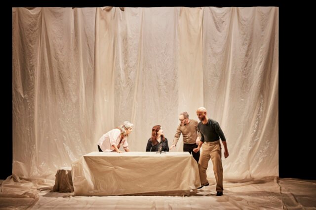 Sebuah proyek ambisius tentu saja, yang ditangani dengan apik oleh Pauline Susini, setidaknya untuk keseluruhan bagian pertunjukan. Panggungnya dilapisi layar putih dan mengingatkan pada tempat yang sedang dibangun, seperti peti mati besar yang dibangun untuk persidangan di jantung Istana Kehakiman, atau ruang peringatan keagamaan dengan altar berbentuk katafalque. Berbagai tempat yang diusulkan yang akan diperluas lebih lanjut tergantung pada situasi yang disajikan, seorang wanita muda yang menceritakan cintanya pada Paris, pertengkaran pasangan yang hancur karena kehilangan seorang anak sejak awal. Sebelum, selama, setelahnya, Pauline Susini mengabaikan kengerian serangan itu sendiri untuk lebih mengungkap kata-kata penuh vitalitas dari mereka yang membawanya. Bukan pathos, melainkan pembentukan kata umum, garis besar cerita yang bermandikan mitologi yang tidak mengabaikan tragedi, namun merekonstruksi yang lain. Ini adalah thread yang telah kami ikuti selama satu jam.