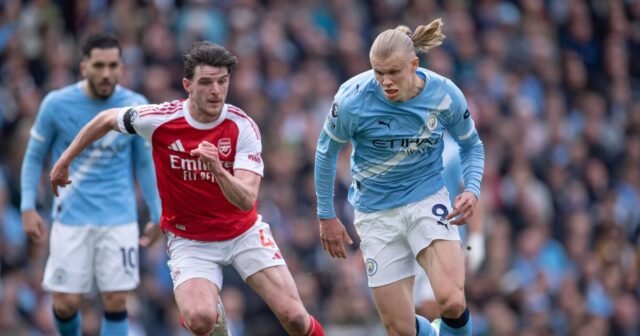 Erling Haaland dari Manchester City dan Declan Rice dari Arsenal beraksi (Gambar: Visionhaus/Getty Images)