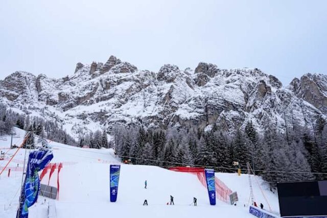 Direktur lomba mempersiapkan lintasan sebelum sesi latihan ski alpine resmi untuk acara menuruni bukit putri pada Olimpiade Musim Dingin 2026 di Cortina d’Ampezzo, Italia, pada hari Jumat, 6 Februari 2026. (AP Photo/Giovanni Auletta)