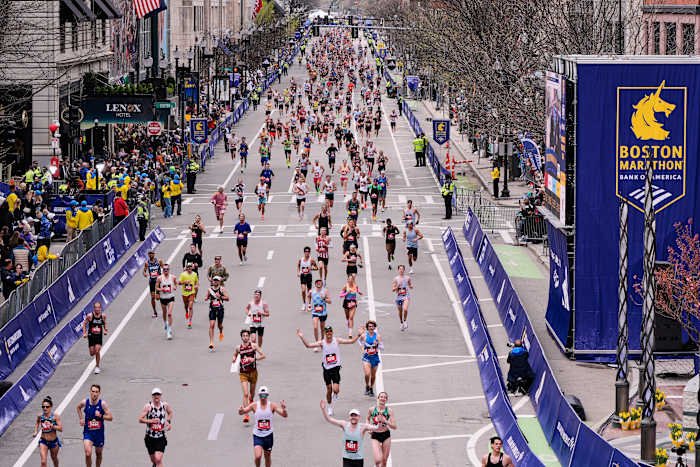 Pelari menyusuri Boylston Street saat mendekati garis finis Boston Marathon, Senin, 20 April 2026, di Boston. (Foto AP/Charles Krupa) (Charles Krupa, Hak Cipta 2026 The Associated Press. Semua hak dilindungi undang-undang)