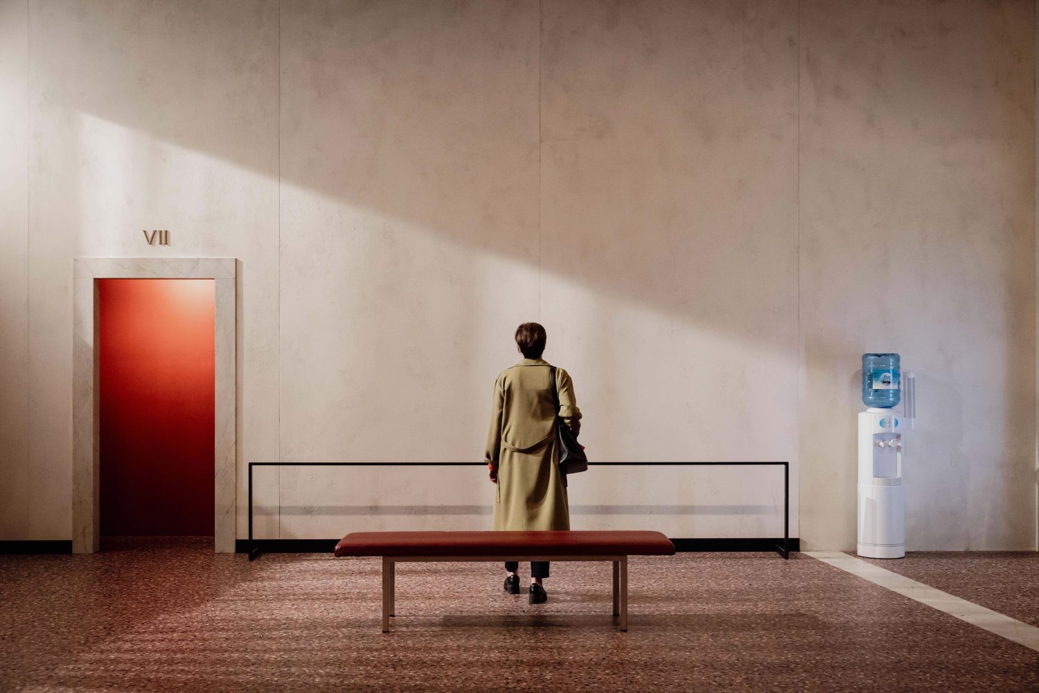 Di salah satu tepi panggung, di sebelah kanan, yakni di lapangan dalam jargon teater, botol airnya kosong. Dan tidak ada yang datang untuk menukarnya dengan salinan lengkap. Sangat dekat dengan mesin ini, yang sudah tidak berguna lagi, mesin sandwich dan kue berfungsi. Beberapa kursi melengkapi ruang yang disediakan untuk staf……