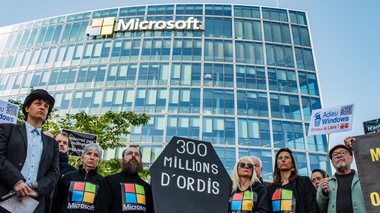 Sekitar dua puluh orang, kebanyakan berpakaian hitam, berjalan ke depan dengan ekspresi muram di depan kantor pusat Microsoft di Issy-les-Moulineaux (Hauts-de-Seine). Sesampainya di depan pintu masuk menuju gedung raksasa tersebut, prosesi berhenti dan keempat pembawa berpakaian warna-warna perusahaan multinasional IT menempatkan peti mati yang dihias dengan bunga, di atasnya kita dapat membaca tulisan berikut: 300 juta komputer.