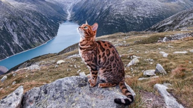 Nelson, kucing petualang yang berpose di tengah pegunungan di depan Haagenau SPA