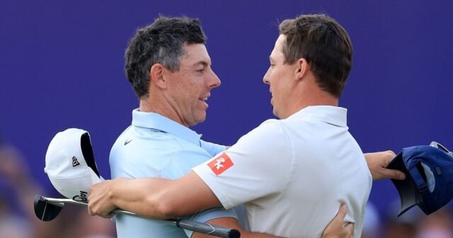 Pemain berusia 36 tahun itu berjuang keras dari ketertinggalan dua pukulan di T5 bersama Rasmus Neergaard-Petersen untuk memenangkan lubang ke-18 dan memaksa pemimpin Fitzpatrick melakukan tie-break. McIlroy, yang menunjukkan ekspresi lelah setelah empat hari akhir musim yang sibuk, terlihat bertukar kata sebentar dengan pemain berusia 31 tahun itu tepat sebelum kedua pria itu menyelesaikan ulangan par-lima ke-18. Duduk di kereta dan siap berangkat, Fitzpatrick bercanda: “Oh ayolah… Kamu tidak boleh lelah, kita masih punya beberapa lubang tersisa,” sebelum McIlroy terkekeh dan membalas: “Mudah-mudahan satu.”