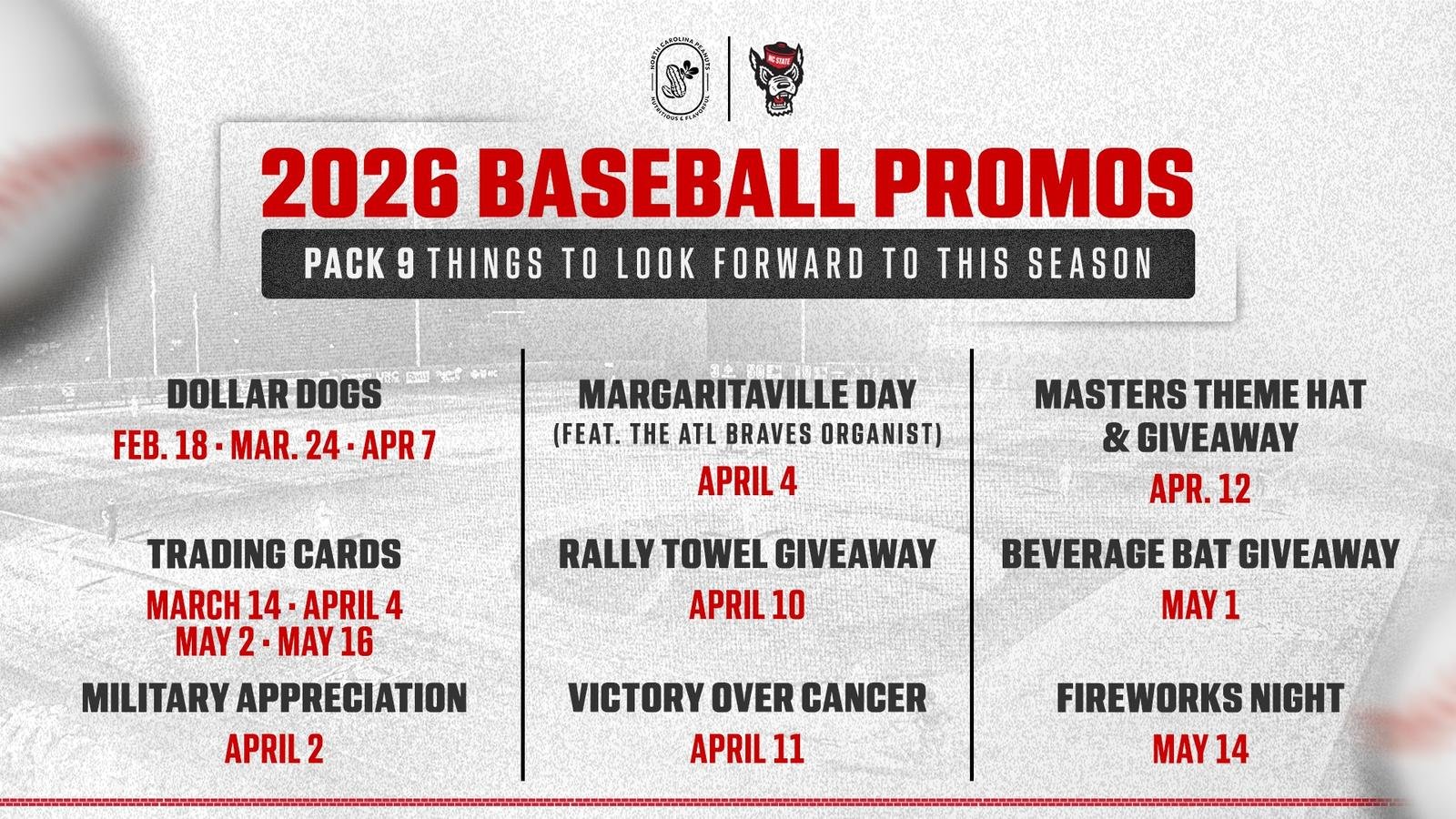 Penggemar paket dapat mengumpulkan kartu perdagangan bisbol NC State mereka sendiri dengan empat set pemain Paket berbeda sepanjang musim. Set pertama akan dirilis pada 14 MaretTh kepada 500 penggemar pertama saat Wolf Pack menghadapi Boston College. Tiga set lainnya akan didistribusikan pada 4 AprilTh2 Meidan, dan 16 MeiTh.