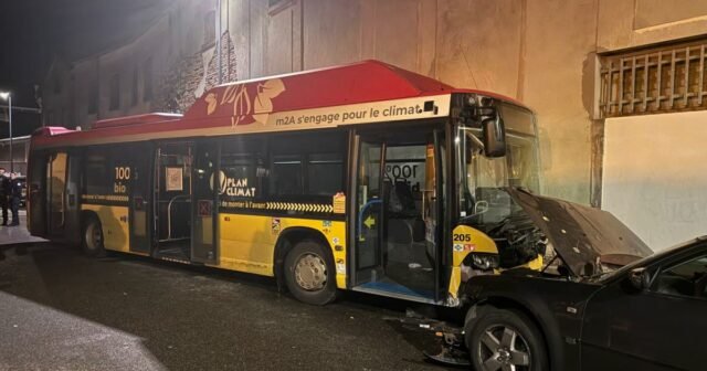 Keadaannya tidak jelas, tetapi pada pukul 19.20. terjadi tabrakan antara bus Soléa dan mobil. Sabtu ini di Avenue Aristide Briand, di Mulhouse, poros yang hanya bisa digunakan oleh bus.