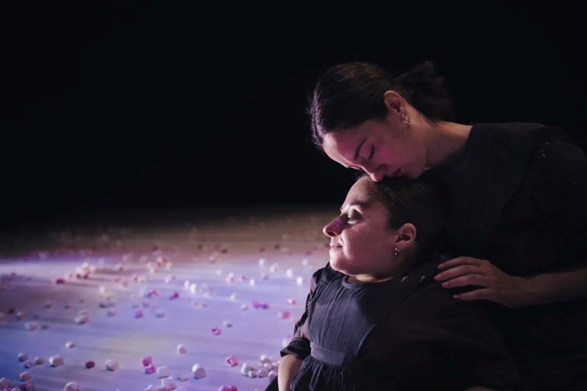 Artis yang memiliki tinggi badan 98 sentimeter dan mengidap osteogenesis imperfekta (penyakit genetik) ini hanya bisa bergerak dengan lengannya, kakinya tak mampu menopang. Dia bergerak dengan lembut dan halus melintasi tanah, menandai jedaElena Sgarbossapenari lain, yang awalnya bersembunyi di balik panggung – awalnya kita hanya melihat kakinya – juga mulai bergerak; kemudian dia akan bergabung dalam ruang pertunjukan dan kedua artis tersebut masing-masing akan menampilkan musik koreografinya. Gerakan mereka sederhana, kadang dilakukan sendiri-sendiri, kadang bersama-sama, bahkan sampai berpelukan. Dalam sifat hemat dan lemah lembut, mereka mengekspresikan kepedulian satu sama lain, mendengarkan dan memperhatikan secara terus-menerus. Pakaian mereka yang identik – gaun dan celemek hitam besar yang mengingatkan pada pakaian wanita sederhana dari abad yang lalu – mengacu pada pandangan yang berbeda dari orang yang sama – yang terombang-ambing antara tubuh yang sopan dan tubuh yang tangguh – seperti halnya pada komunitas kecil. Tanpa pernah mengambil keputusan, atau benar-benar mempertahankan satu posisi dibandingkan yang lain. Ada baiknya juga jika karakter yang sangat pendiam secara bertahap menjauhkan Anda dan membuat Anda berhati-hati.