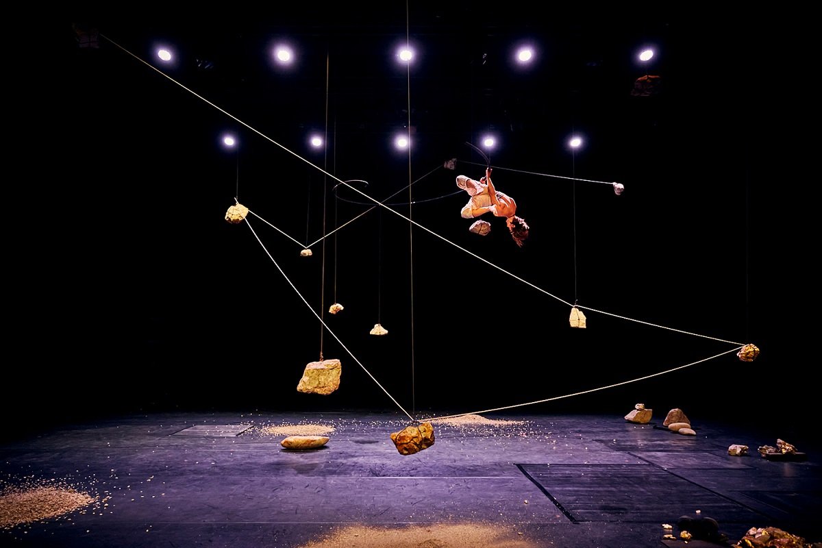 Kerikil, batu dan kristal menjadi mitra, perangkat sirkus dan suspensi, krayon untuk menekankan gerak dan ruang, kristal yang dapat dimakan yang renyah dan memberi nutrisi, batu perkusi yang mengisi ruang suara, elemen pemandangan dan dramaturgi.