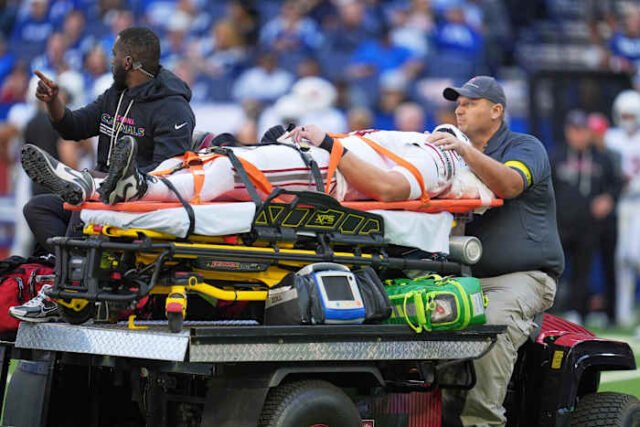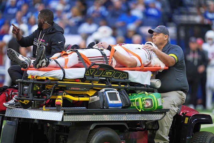 Travis Vokolek dari Arizona Cardinals dibawa keluar lapangan dengan kereta selama paruh pertama pertandingan sepak bola NFL melawan Indianapolis Colts pada Minggu, 12 Oktober 2025, di Indianapolis. (Foto AP/Michael Conroy)