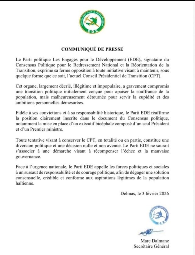 Partai politik Les Engagés pour le Développement (EDE), yang menandatangani Konsensus Politik untuk Pemulihan Nasional dan Reorientasi Transisi, menyatakan penolakannya terhadap inisiatif apa pun yang bertujuan mempertahankan Dewan Transisi Kepresidenan (CPT) saat ini dalam bentuk apa pun.